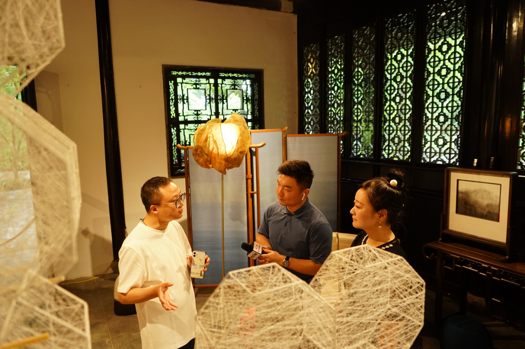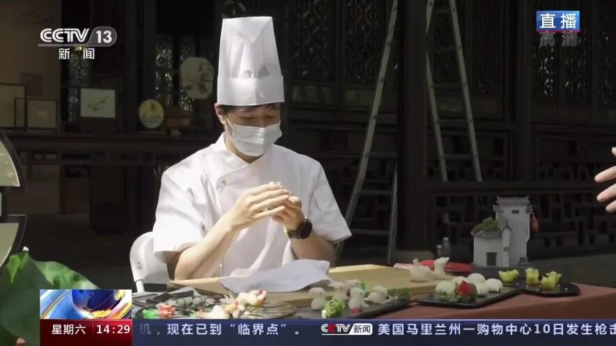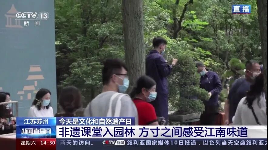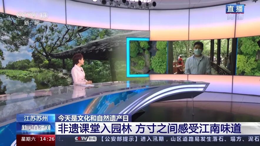 下午,CCTV13新闻频道《新闻直播间》连线苏州拙政园活动现场,进行了直播报道。直播中,央视总台记者给全国观众介绍了苏州缂丝的通经断纬,苏绣的精细雅洁和船点的精致小巧,现场的13项非遗技艺尽显江南味道。