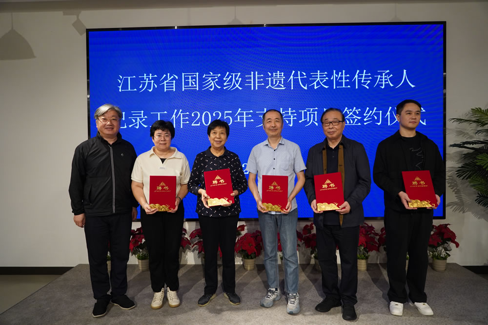 仪式上,江苏省非遗保护中心与中标执行团队签署了合作协议,并向2025年支持项目的学术专员颁发了聘书。随后举行的交流座谈环节,各方人员围绕非遗项目概况、传承人基本情况、地方社会习俗与文化背景等内容进行了详尽沟通,为后续田野调查工作奠定了良好基础。