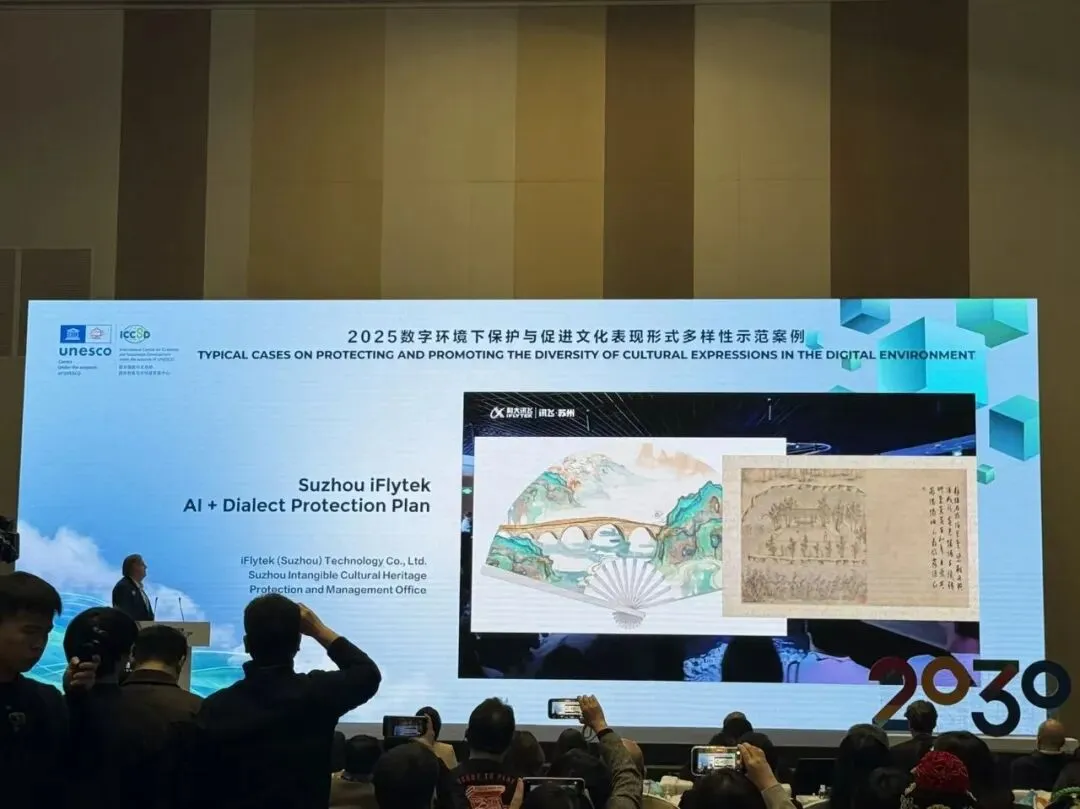 40个兼具创新性、可持续性与跨文化可复制潜力的示范案例脱颖而出。苏州市非物质文化遗产保护管理办公室联合科大讯飞(苏州)科技有限公司(以下简称苏州讯飞)、苏州博物馆共同推进的“AI+方言保护计划”项目成功入选,成为数字时代文化多样性保护的创新样本,彰显非遗保护部门统筹协调、科技赋能传统文化传承的核心价值。